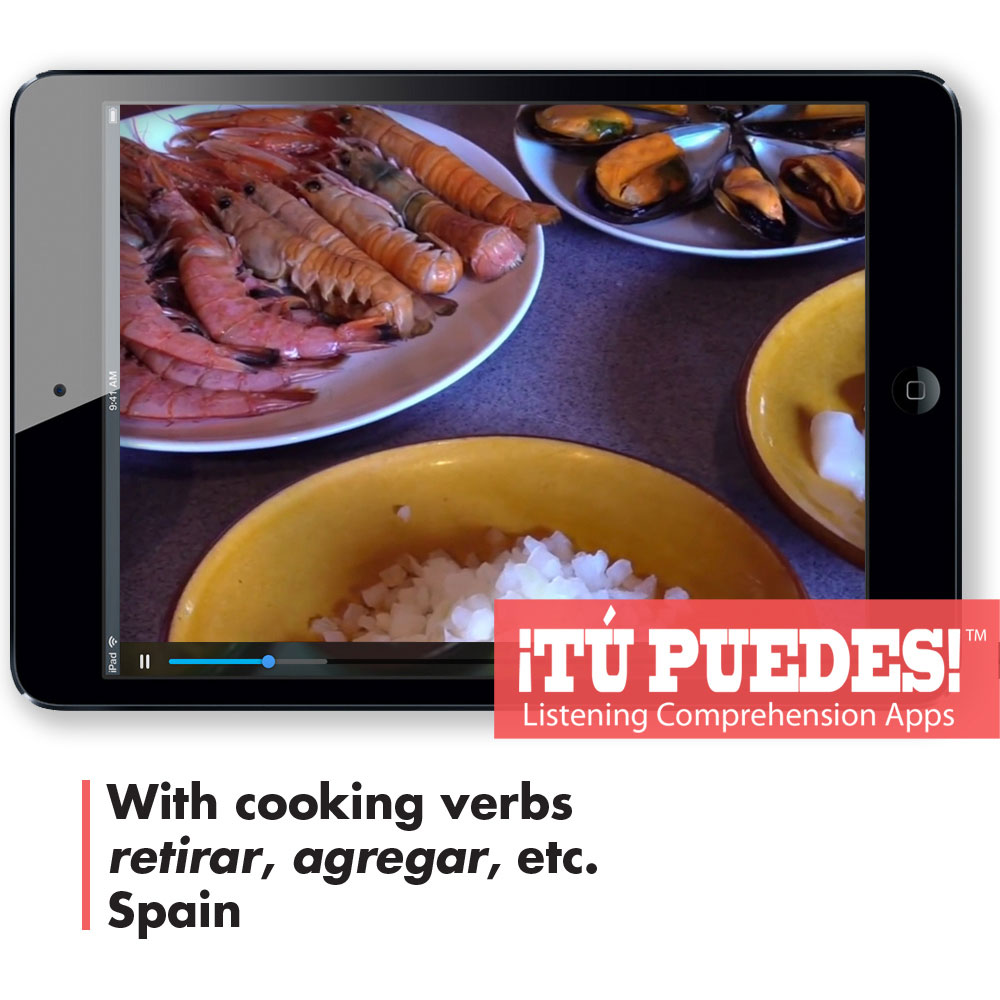 A real-world Spanish audio/visual listening clips, edited to under two minutes and accompanied by three levels of quizzes (Novice, Intermediate, and Advanced). As you listen, the clip pauses from time to time and asks the user a question. Once the question is answered, the video will resume playing. If you want you can replay the last part of the clip by pulling the video marker back. After the last question, students can review their results and send them to their teacher.Making Paella//br /With cooking verbsbr /retirar, agregar,/ etc.br /SpainHow it works:/br /1. You buy the app and we email the link to generate your 3 different level quiz codes.br /2. Tell your students to go to tupuedesapp.com/ on their computer or mobile device.br /3. Give your students the code for the quiz and have them do the exercise.br /4. Students press “Save and Submit” and their scores go to your results page.span style=”color: #FF3333″ To buy all 25 Listening Comprehension Apps a “https://www.teachersdiscovery.com/product/28055/spanish”click here./a//span