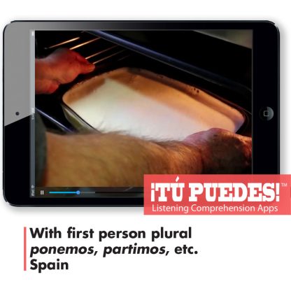 A real-world Spanish audio/visual listening clips, edited to under two minutes and accompanied by three levels of quizzes (Novice, Intermediate, and Advanced). As you listen, the clip pauses from time to time and asks the user a question. Once the question is answered, the video will resume playing. If you want you can replay the last part of the clip by pulling the video marker back. After the last question, students can review their results and send them to their teacher.Making Spanish Flan//br /With first person pluralbr /ponemos, partimos,/ etc.br /SpainHow it works:/br /1. You buy the app and we email the link to generate your 3 different level quiz codes.br /2. Tell your students to go to tupuedesapp.com/ on their computer or mobile device.br /3. Give your students the code for the quiz and have them do the exercise.br /4. Students press “Save and Submit” and their scores go to your results page.span style=”color: #FF3333″ To buy all 25 Listening Comprehension Apps a “https://www.teachersdiscovery.com/product/28055/spanish”click here./a//span