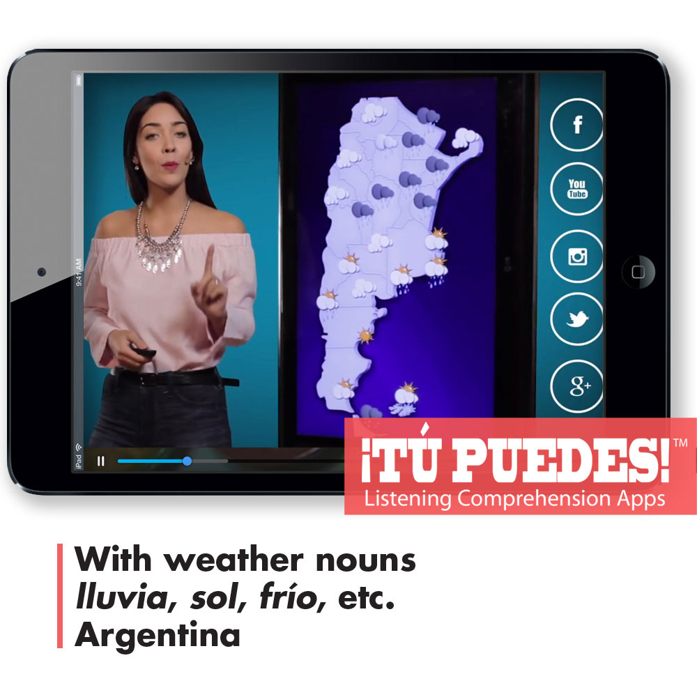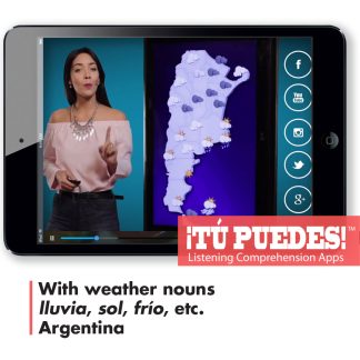 A real-world Spanish audio/visual listening clips, edited to under two minutes and accompanied by three levels of quizzes (Novice, Intermediate, and Advanced). As you listen, the clip pauses from time to time and asks the user a question. Once the question is answered, the video will resume playing. If you want you can replay the last part of the clip by pulling the video marker back. After the last question, students can review their results and send them to their teacher.Weather Report/br /With weather nounsbr /lluvia, sol, fr;iacute;o,/ etc.br /ArgentinaHow it works:/br /1. You buy the app and we email the link to generate your 3 different level quiz codes.br /2. Tell your students to go to tupuedesapp.com/ on their computer or mobile device.br /3. Give your students the code for the quiz and have them do the exercise.br /4. Students press “Save and Submit” and their scores go to your results page.span style=”color: #FF3333″ To buy all 25 Listening Comprehension Apps a “https://www.teachersdiscovery.com/product/28055/spanish”click here./a//span