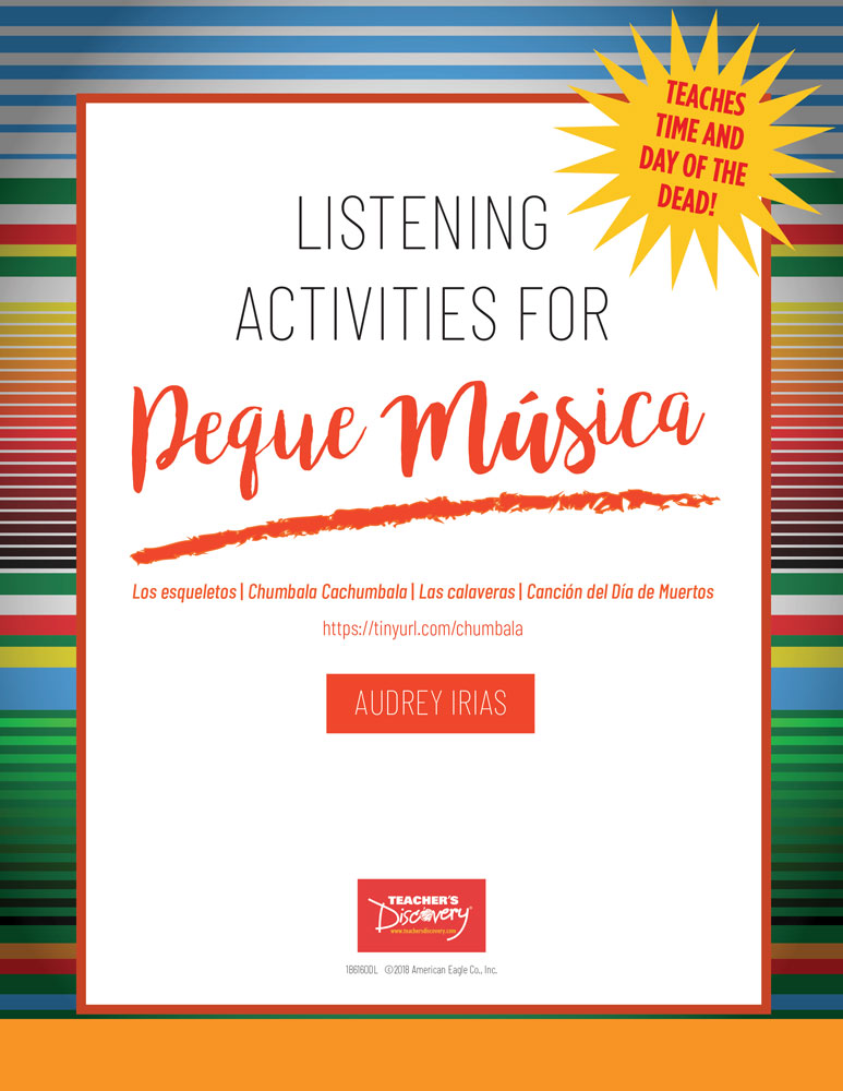 ;ldquo;Cuando el reloj marca la una, las calaveras salen de su tumba;rdquo;/em is just one thing that those silly calaveras/em do! This eight-page activity packet includes six activities around the lively rock song ;ldquo;D;iacute;a de los Muertos;rdquo;/em by Mexican YouTube channel, Pequ;eacute; M;uacute;sica. Each activity focuses on a different element as students listen again and again: reading along, discussing the intent of the singer/songwriter, recognizing words, analyzing what the song means, evaluating the symbols used in the video, and writing words as they hear them in blanks for cloze activities.Copyright 2018. English, Spanish. Level 1, Novice Low. 8 x 11 inches. PDF download. Adobe Reader to view PDF. 14 pages. img alt=”” src=”//aedownload.net/teachersdiscovery/images/Author_Audrey_Irias.jpg” style=”float: left; border-width: 0px; border-style: solid; margin: 0px 6px; height: 135px; padding-right: 10px;” /About the Author Audrey Yates Irias started learning Spanish at age 10 in a FLEX program in her elementary school, because her aunt lived in Puerto Rico. She was so enamored with learning languages that she dove in head first, and took multiple years of Spanish and French in high school. Following her passion, she was a double major in Spanish and French Education and a TESOL minor, at Illinois State University–during which time she studied in Spain and France. She taught for 11 years in both traditional as well as virtual classrooms. In 2016, she earned her master’s in Translation and Interpreting from the University of Illinois.Audrey enjoys spending time with her daughter, dancing, teaching students one-on-one, and developing curriculum that benefits students and teachers of World Languages.
