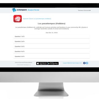 Save time by adding this Los pasatiempos/ Oral Assessment to a class in your Extempore account. Assessment contains five questions with a mix of images and authentic Spanish audio to assess your students’ oral abilities. Once you purchase this Oral Assessment package, a link explaining how to add it to your classes in Extempore will be sent to you. It’s simple. Requires an Extempore subscription./Copyright 2019. Spanish. Level 1. Middle school, high school.Don’t Have the Extempore App?/ Try it for FREE ua “//store.extemporeapp.com/new/td” target=”_blank”here/a/u. Learn more about purchasing options a “//extemporeapp.com/how-to-buy/?from=td” target=”_blank”here/a.What Is the Extempore App?/br /With the Extempore app, you can create speaking assignments in minutes and assess your students’ Spanish spoken answers! Timers and other parameters allow you to control how spontaneous the response needs to be. Your students then submit video or audio responses on their phones, tablets, or computers. You can grade the assessments on your computer or on the go, creating a digital portfolio to track each student’s performance. If you don’t already have the app, learn more ua “//landing.extemporeapp.com/what-is-extempore-td” target=”_blank”here/a/u.