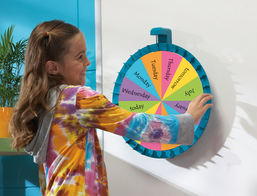 Simply place the spin wheel on your whiteboard, or any metal surface, and use your dry-erase markers to create games and activities. Use it as a classroom management tool and to play subject-specific games — the possibilities are limitless. The Magnetic Spin Wheel gets kids on their feet and participating. Includes three double-sided dry-erase cards and a teacher;#39;s guide. Size is 16 inches in diameter with heavy-duty magnets.Some suggestions for use in your classroom: Write consonants in the wheel spaces. Have students take turns spinning the wheel, identifying the consonant spun and saying (or writing on the board) a word that begins with that consonant. Write vowels in the wheel spaces. Have students take turns spinning the wheel, identifying the vowel on which the wheel lands and saying a word (or writing one on the board) that contains the vowel;#39;s short or long sound. Write word families in the wheel spaces, such as dash;ab, dash;ad, dash;ag, dash;am,dash;an, dash;ap, dash;at, dash;ack. Have students take turns spinning the wheel,saying a word that belongs to the word family spun and writing it onthe board. Teams of students can compete with one another. Just spin the wheel and have team members write as many words as they can on the board using the word family indicated. Write sight words in the wheel spaces. A student spins the wheel, reads the word and uses it in a sentence.