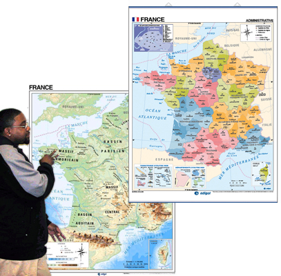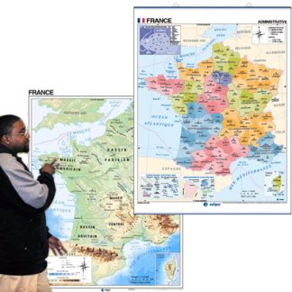 Updated! The French map of France now reflects the “New Territory Organization.” This colorful, two-sided wall map features physical characteristics on one side and political information on the other. Physical side shows mountain ranges, lakes, rivers and other geographical features. Political side shows capitals, principal cities, and towns. Its travel-friendly form is easily rolled and taken from room to room. All levels. All text in French. 36 x 46 inches. Matte, durable, flexible, wipeable, lightweight vinyl.