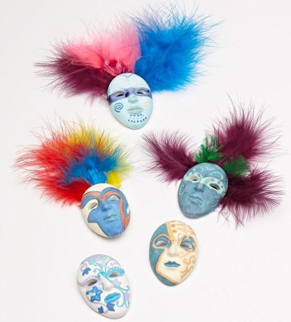 A simple and easy craft kit for students to complete in one classroom period. Just give your students a ceramic mask and markers for decorating. Then, have them add a drop of glue to the back for decorative feathers and to place the magnet. Let the glue dry overnight, and you have a cultural lesson that is fun for the students and easy on you.Mardi Gras/Carnaval/Karneval Mask Decorating Kit contains 30 ceramic masks, 60 markers to share, 30 strong magnets, three bags of feathers, and three bottles of glue.Already have markers, feathers, and glue? Get the Mardi Gras/Carnaval/Karneval Masks and Magnets ONLY Set without any of the art supplies. Kit contains 30 ceramic masks and 30 magnets. You supply the markers, feathers, and glue. All levels.