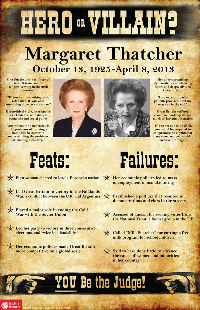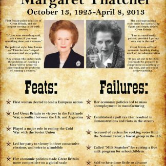 History tends to judge historical figures in extremes, and it can be tempting to view the world in black and white. Use this Margaret Thatcher mini-poster to encourage students to look beyond established narratives into the real world of gray.Copyright 2019. 11 x 17 inches. Cardstock.
