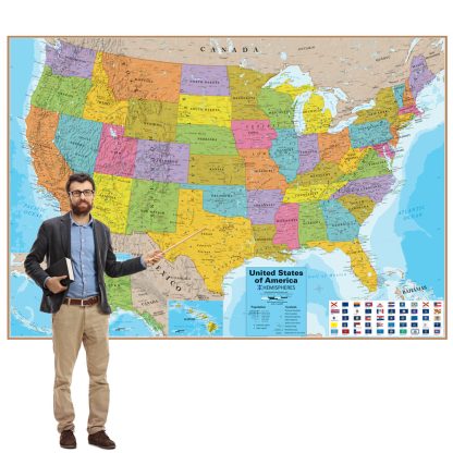 Identify state capitals, cities, Native American reservations, and so much more with a map that covers your entire classroom wall! Students show their knowledge of the United States with a write-on, wipe-off map. Map is divided into four sections, each measuring approximately 6 x 4 feet Vinyl material with removable backing is easy to install For use with dry- or wet-erase markersCopyright 2020. All levels. 11.5 x 8 feet. Laminated.