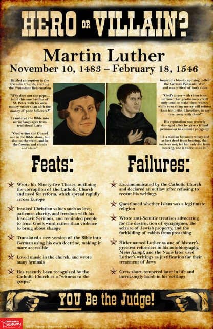 History tends to judge historical figures in extremes: Genghis Khan was a barbarian! Alexander the Great WAS great! As teachers, it’s tempting at times to present the world as black and white to our students: good or evil, friend or foe, hero or villain. Use this Martin Luther mini-poster to encourage students to take off the rose-colored glasses and see beyond the established historical narratives, into the real world of gray. Copyright 2017. Middle school, high school. 11 x 17 inches. Cardstock.