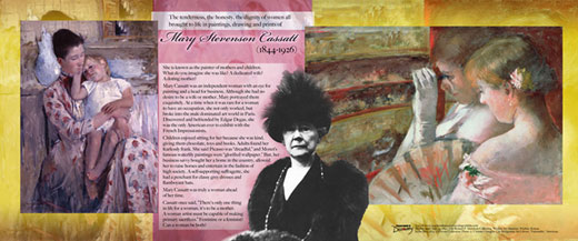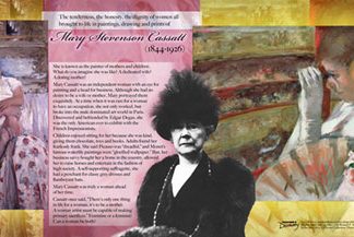 Strong and independent, yet with an uncanny ability to capture both the strength and tenderness of mothers, Mary Cassatt was the only American to exhibit with the French Impressionists. Her paintings and prints preserve another era, but the emotion is timeless.brbrLightweight satin panels are easy to install from any drop ceiling. All prices include rental, shipping, handling and return shipping. Images include: Mother and Child and In The Box (7×17), The Boating Party (4×8) and The Lamp (4×4).br /All prices include rental and shipping and handling both ways.br /1 week $479br /2 weeks $799br /3 weeks $1,199br /4 weeks $1,499br /7 weeks $1,999br /Reserve this exhibit online by visiting a “http://www.travelingexhibits.org/exhibits/mary-cassatt-traveling-exhibit-p1126/” target=”_blank”travelingexhibits.org/a.