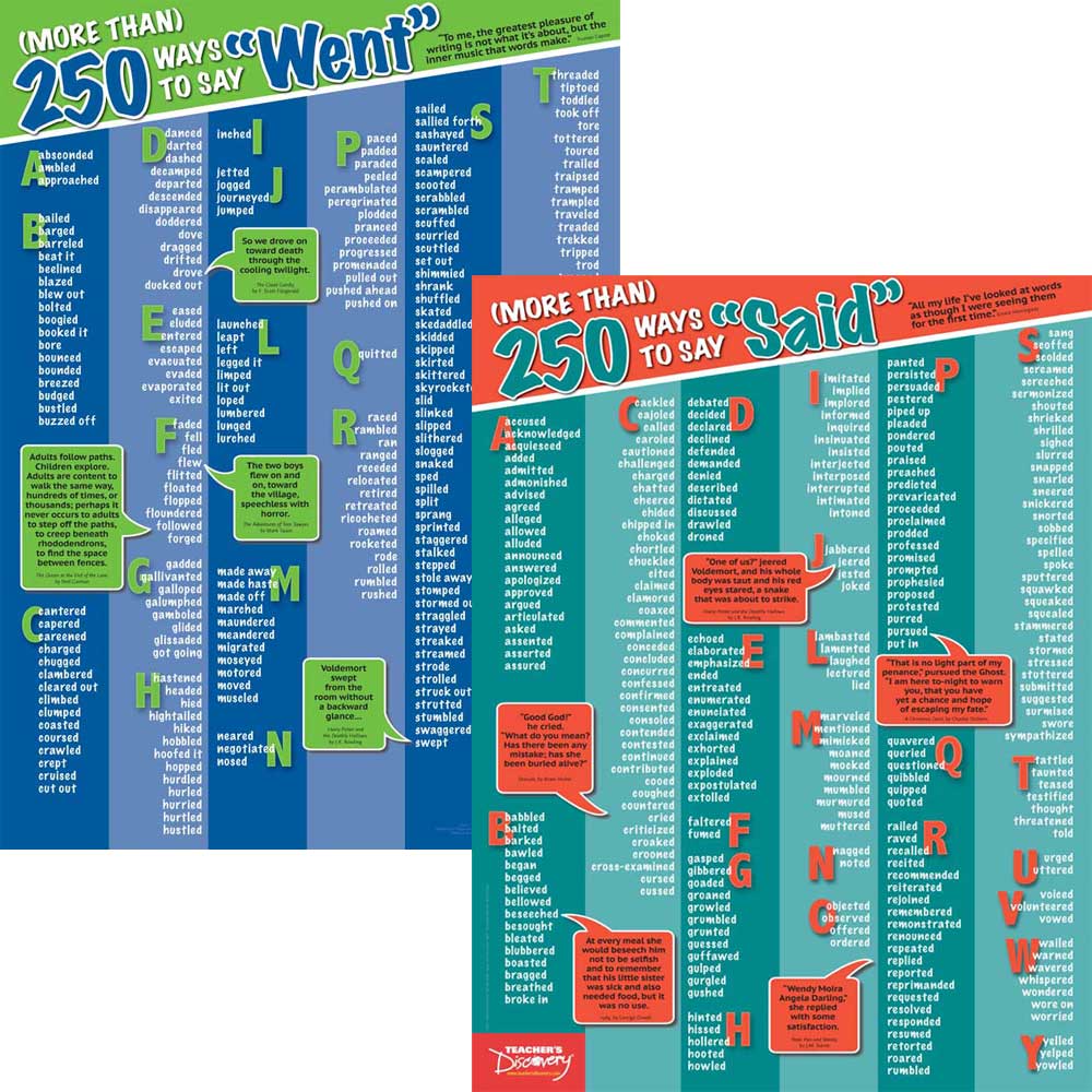 (More Than) 250 Ways to Say “Went” Poster (4P1984)Who knew there were so many ways to get a chicken across the road! Colorful list of synonyms expands creative writing.(More Than) 250 Ways to Say “Said” Poster (4P1985)No more “he said, she said” in your students writing!Fresh fun ways to get the point across.Copyright 2015. 19 x 27 inches. Laminated.