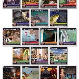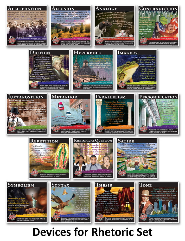 Each of the 18 posters in the set lists a device used for rhetoric, its definition, and a quote from a rhetorical text.table border=”0″ cellpadding=”0″ cellspacing=”0″ tbody tr td style=”width:204px;height:102px;” Some featured authors:br / ;bull; C;eacute;sar E. Ch;aacute;vezbr / ;bull; Norman Mailerbr / ;bull; Annie Dillardbr / ;bull; Molly Ivinsbr / ;bull; Patrick Henry /td /tr tr td style=”width:204px;height:289px;” Set includes:br / ;bull; alliterationbr / ;bull; allusionbr / ;bull; analogybr / ;bull; contradictionbr / ;bull; dictionbr / ;bull; hyperbolebr / ;bull; imagerybr / ;bull; juxtapositionbr / ;bull; metaphorbr / ;bull; parallelismbr / ;bull; personificationbr / ;bull; repetitionbr / ;bull; rhetorical questionbr / ;bull; satirebr / ;bull; symbolismbr / ;bull; syntaxbr / ;bull; thesisbr / ;bull; tone /td /tr /tbody/tableCopyright 2016, Teacher;#39;s Discovery. High school.Print Posters: 12 x 12 inches. Coated cardstock. 18 posters.Projectable Download: PDF. 18 pages. Adobesup/sup Readersup/sup required to view PDF.