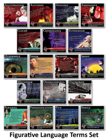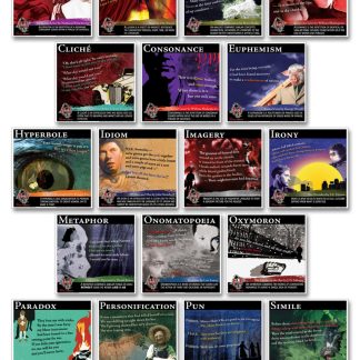 Reinforce figurative language terms using quotes from classic literature by authors Hawthorne, Shelley, Shakespeare, Steinbeck, Salinger, Bradbury, Fitzgerald, Orwell, Twain, and more. Each of the 18 mini-posters features a different literary term, definition, and quote.table border=”0″ cellpadding=”0″ cellspacing=”0″ tbody tr td style=”width:150px;height:286px;” Set includes:br / ;bull; alliterationbr / ;bull; allusionbr / ;bull; analogybr / ;bull; assonancebr / ;bull; clich;eacute;br / ;bull; consonancebr / ;bull; euphemismbr / ;bull; hyperbolebr / ;bull; idiombr / ;bull; imagerybr / ;bull; ironybr / ;bull; metaphorbr / ;bull; onomatopoeiabr / ;bull; oxymoronbr / ;bull; paradoxbr / ;bull; personificationbr / ;bull; punbr / ;bull; simile /td /tr /tbody/tableCopyright 2010, Teacher;#39;s Discovery. Middle school, high school.Print Posters: 12 x 12 inches. Coated cardstock. 18 posters.Projectable Download: PDF. 18 pages. Adobesup/supReadersup/suprequired to view PDF.