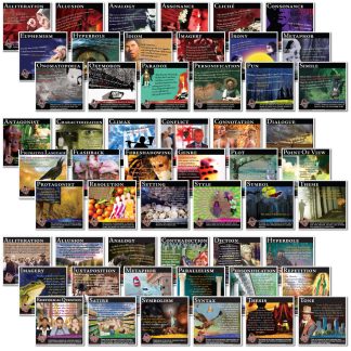Strengthens your students;#39; understanding of key devices for literature and nonfiction. Each of the 54 posters displays a term, its definition, and an illustrating quotation from literature or nonfiction.table border=”0″ cellpadding=”0″ cellspacing=”0″ tbody tr td colspan=”4″ style=”width:480px;height:11px;” Set includes: /td /tr tr td style=”width:42px;height:289px;” /td td style=”width:150px;height:289px;” Figurative Language Termsbr / ;bull; alliterationbr / ;bull; allusionbr / ;bull; analogybr / ;bull; assonancebr / ;bull; clich;eacute;br / ;bull; consonancebr / ;bull; euphemismbr / ;bull; hyperbolebr / ;bull; idiombr / ;bull; imagerybr / ;bull; ironybr / ;bull; metaphorbr / ;bull; onomatopoeiabr / ;bull; oxymoronbr / ;bull; paradoxbr / ;bull; personificationbr / ;bull; punbr / ;bull; simile /td td style=”width:150px;height:289px;” Literary Termsbr / and Devicesbr / ;bull; antagonistbr / ;bull; characterizationbr / ;bull; climaxbr / ;bull; conflictbr / ;bull; connotationbr / ;bull; dialoguebr / ;bull; figurative languagebr / ;bull; flashbackbr / ;bull; foreshadowingbr / ;bull; genrebr / ;bull; plotbr / ;bull; point of viewbr / ;bull; protagonistbr / ;bull; resolutionbr / ;bull; settingbr / ;bull; stylebr / ;bull; symbolbr / ;bull; theme /td td style=”width:138px;height:289px;” Devices forbr / Rhetoricbr / ;bull; alliterationbr / ;bull; allusionbr / ;bull; analogybr / ;bull; contradictionbr / ;bull; dictionbr / ;bull; hyperbolebr / ;bull; imagerybr / ;bull; juxtapositionbr / ;bull; metaphorbr / ;bull; parallelismbr / ;bull; personificationbr / ;bull; repetitionbr / ;bull; rhetorical questionbr / ;bull; satirebr / ;bull; symbolismbr / ;bull; syntaxbr / ;bull; thesisbr / ;bull; tone /td /tr /tbody/tablete: Alliteration/, allusion/, analogy/, hyperbole/, imagery/, metaphor/, and personification/ are repeated terms as both literary and rhetorical examples are included in the combined poster set.Set of 54 posters. High school. 12 x 12 inches. Coated cardstock.