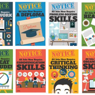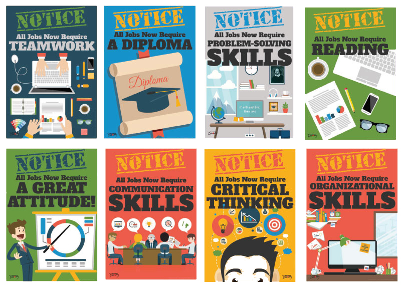 The concepts you teach in your classroom every day are important job skills, too. Remind your students in a lighthearted way to keep their eyes on the future! Set of eight posters: Attitude Communication Skills Critical Thinking Skills Diploma Reading Skills Organization Skills Problem-Solving Skills Teamwork/br Copyright 2015. 13 x 19 inches. Cardstock. Not laminated. Middle school, high school.