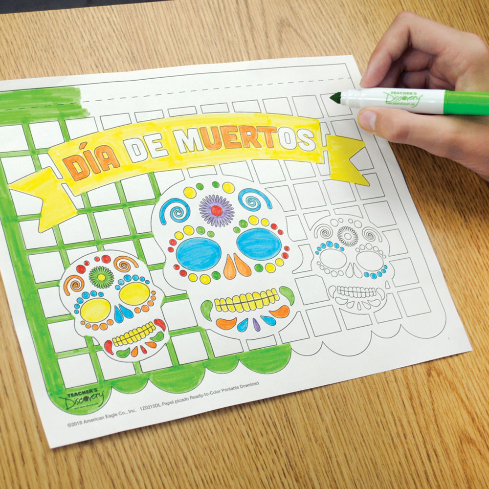 Get your classroom ready for Day of the Dead with printable, ready-to-color papel picado panels! It’s easy, fun, and affordable! This PDF download includes six ready-to-color designs and instructions. Let your students select their favorite design, then print, customize, cut, and display! Reproducible, designs print on 8.5 x 11-inch paper.Copyright 2018. Download. PDF. Adobe Reader required to view PDF. 7 pages.