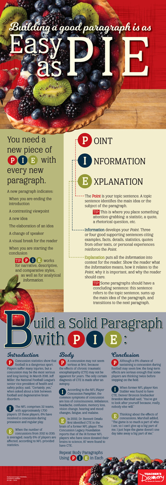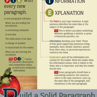 Serve a piece of PIE when it’s time to write a well-constructed paragraph: Point, Information, and Explanation. Tips and questions students can ask themselves as they write help build solid paragraphs and a great essay.Copyright 2016. 13 x 38 inches. Laminated. Middle school, high school.