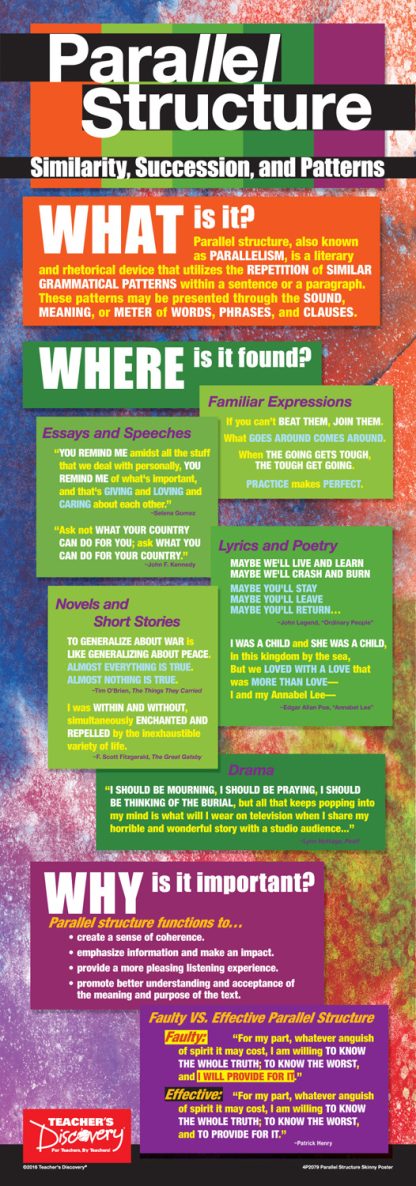 Exemplifies the What, Where, and Why of parallel structure in writing.Copyright 2016. 13 x 38 inches. Laminated.
