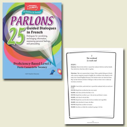 Need a simple and fun way to encourage class participation? You needParlons/em:25 Guided Dialogues in French.Get your first-year students talking about real topics–school, family, friends, leisure time, clothing, shopping, health, travel, celebrations, the environment, careers–in simple French. Throughout these guided conversations, your students will improve their vocabulary, increase their speaking ability, and develop critical thinking skills. Writing original, creative “twists” to the dialogues will enhance your classroom curriculum and turn oral presentations into fun activities. All students will be engaged both as presenters and listeners.Parlons/emconforms to the National Foreign Language Standards by breaking down dialogues into the four standard functions: socializing, exchanging information, expressing personal feelings, and persuading others.Copyright 2015. French. Beginning. Middle school, high school. Reproducible. 144 pages.Book Download: PDF. Adobe Reader required to view PDF.Print Book: Three-ring binder. 10 x 12 inches. Three-hole-punched, loose-leaf paper. 8 x 11 inches.img alt=”” src=”//aedownload.net/teachersdiscovery/images/Author_Paula_Twomey_Sachuaman_Peru.jpg” style=”float: left; border-width: 0px; border-style: solid; margin: 0px 6px; height: 160px; padding-right: 10px;” /About the AuthorPaula Twomey/ is a Rockefeller Fellow, has a BA from SUNY Albany and an MA from Middlebury College, and is currently an adjunct instructor at Ithaca College. After 31 years in the classroom, Paula still enjoys teaching, traveling, mentoring, writing curriculum, authoring books, and giving advice!
