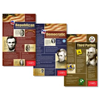 Students will gain a better understanding of the American political party system when they see the many differences and similarities between political parties. Each poster features the history and purpose of the party with examples, easy to read explanations, and bullet statements to use as a reference guide in the classroom.Set includes:Republican PartyDemocratic PartyThird PartiesCopyright 2012, Teacher’s Discovery. 18 x 24 inches each. Laminated to last. Middle/high school.span style=”color: #ff0000;”**Click on the “Additional Info” tab for a free Teachable Moments fact sheet./span
