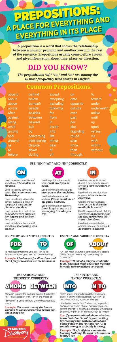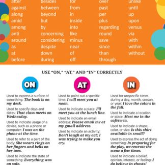Prepositions put things in their place. A colorful list and useful examples help students know and remember how to use them correctly.Copyright 2017. 13 x 38 inches. Laminated.