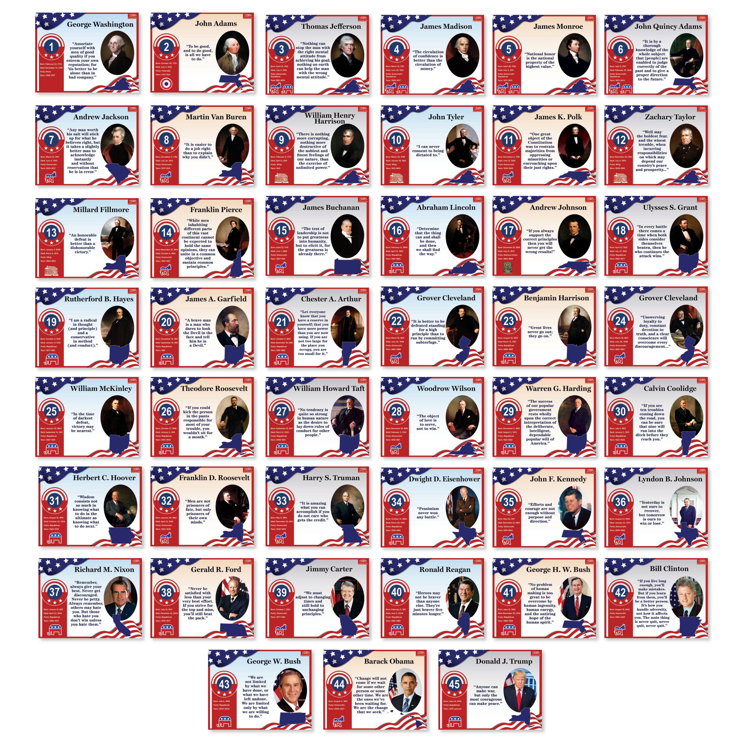 With information presented in text and symbols, Presidential Cue Cards are multitaskers: Use all 45 as a banner on the wall. Card sort: How many presidents have been Democrats? How many have been Republicans? How many presidents were born in Virginia? Quiz: Who was the second president? What do the party symbols mean? GeoFacts: Which state has been the birthplace of the most presidents? Inspiration: Quotes from each president motivate and challenge young minds.Copyright 2019. Set of 45 cards. 8.5 x 11 inches. Laminated cardstock.