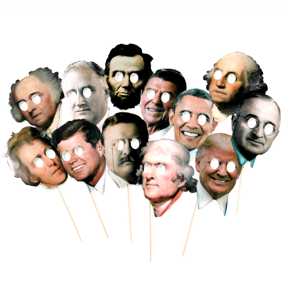 Run on a platform of fun! These assorted die-cut masks feature 12 presidents of the United States. Use them to get your whole class involved with: Presentations Debates Mock trials Wax museums Reenactments Elections Presidents’ Day And so much more!span style=”color: #ff0000;”Download the FREE Teachable Moments PDF located in “Additional Info.” /spanCopyright 2019. All levels. Set of 12 masks, approx. 6 x 12 inches. Cardstock with 12-inch wooden stick handle.