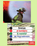 New images, bigger-than-ever cards, updated word listsdash;everything you asked for! Flash cards and bingo games with 32 topic-related vocabulary words. The flash cards are a full 8 x 11 inches with vocab in English, Spanish, French and German; plus a blank space to add your own language on the back. We’ve even included a reproducible study sheet for the students. The bingo games are 8 x 11 inches and include 36 full-color game cards. Bingo images are over 1 inch square and have the classic free space in the middle, great for reinforcement. Includes an envelope for storage. 36 game cards.br /br /Professions vocabulary includes: accountant, actor, astronaut, business man, truck driver, hairdresser, construction worker, cook, vampire, dancer, delivery man, dentist, doctor, electrician, farmer, firefighter, florist, judge, lawyer, makeup artist, mechanic, musician, news reporter, photographer, pilot, plumber, policeman, receptionist, waitress, soldier, teacher and veterinarian.br /