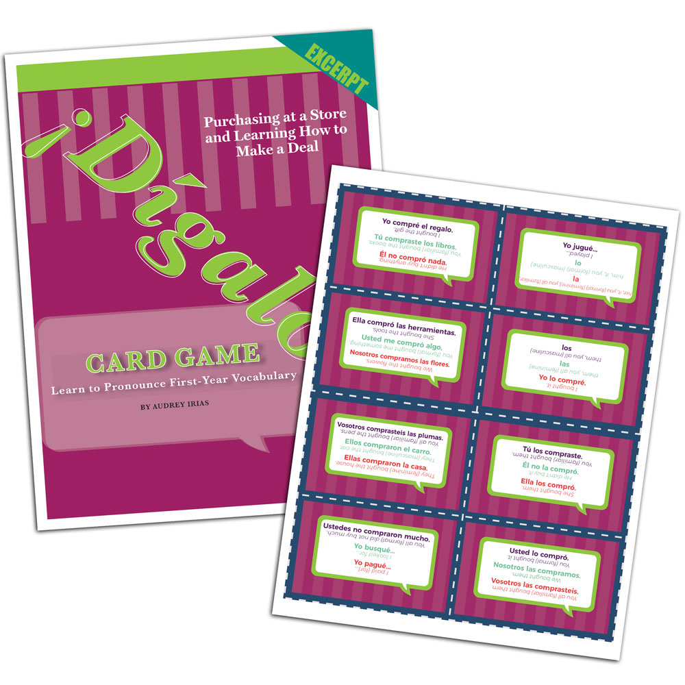 D;iacute;galo/em is a game that enables students to simultaneously practice pronunciation and memorize vocabulary. On one side of the card is a phonetic version of a common expression, if not a whole sentence, associated with the theme of this chapter, chosen to simulate how one would use words and conjugate verbs in that context. On the other side is the actual Spanish version that the student’s teammates will guess, and the English equivalent, upside-down. Vocabulary inspired by the Realidades/em textbook series by Pearson. Some assembly required upon printing.This download includes: Instructions A pronunciation guide A flash card key, also unique by color to this chapter A reference guide unique to this chapter Playing cards, with up to eight cards per sheet, that print exactly back-to-backCopyright 2018. English, Spanish. Beginning. Middle school, high school. Reproducible. Download. PDF, Adobe Acrobat Reader DC required to view PDF. 16 pages. img alt=”” src=”//aedownload.net/teachersdiscovery/images/Author_Audrey_Irias.jpg” style=”float: left; border-width: 0px; border-style: solid; margin: 0px 6px; height: 135px; padding-right: 10px;” /About the Author Audrey Yates Irias started learning Spanish at age 10 in a FLEX program in her elementary school, because her aunt lived in Puerto Rico. She was so enamored with learning languages that she dove in head first, and took multiple years of Spanish and French in high school. Following her passion, she was a double major in Spanish and French Education and a TESOL minor, at Illinois State University–during which time she studied in Spain and France. She taught for 11 years in both traditional as well as virtual classrooms. In 2016, she earned her master’s in Translation and Interpreting from the University of Illinois.Audrey enjoys spending time with her daughter, dancing, teaching students one-on-one, and developing curriculum that benefits students and teachers of World Languages.