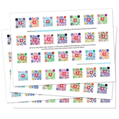 Use these QR code stickers to uncover the hidden accolade and find a surprise video or GIF that will educate or make students chuckle. Each sticker contains a variety so that no two students in the same class should get the same one! Student-tested, teacher-approved!Students will be thrilled to use their phones in class to scan their sticker and see what they find! Simply scan the QR codes with your smartphone or tablet using any free QR code reader.300 assorted full-color stickers. Each square sticker measures approximately 3/4 inch.