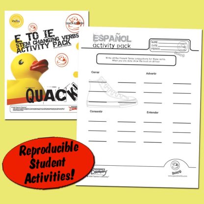 Quack! is a 15-minute outrageously silly, repetitious reinforcement video. Each one has been made for use in your high school classroom. After you explain the concept, just pop in a Quack! Reinforce the tricky stem-changing verbs with this hilarious and entertaining video loaded with examples and explanations of the concept. span style=”color:#FF0000;”Download the free video quiz located in “Additional Info.”/spanCopyright 2006. 15 minutes. Spanish. High school level. Video Download: MP4.Video DVD: DVD.br /The activity packet features activities created in the crazy Quack! style. Activities include fill-in-the-blanks, multiple mistakes, and brain regurgitation. The packet works great in conjunction with the video, but can be used alone. Of course, the packet comes with the Quack! EXTREMELY SILLY warning ……. er, guarantee. Copyright 2006. Spanish. High school level. Reproducible.Activity Packet Download: PDF. Adobe Reader required to view PDF.