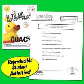 Quack! is a 15-minute outrageously silly, repetitious reinforcement video. Each one has been made for your high school classroom. After you explain the concept, just pop in a Quack! to reinforce it. Review and reinforce the concept of these tricky stem-changers with help from Quack! span style=”color:#FF0000;”Download the free video quiz located in “Additional Info.”/spanCopyright 2006. 15 minutes. Spanish. High school level. Video Download: MP4.Video DVD: DVD.br /The activity packet features activities created in the crazy Quack! style. Activities include fill-in-the-blanks, multiple mistakes, and brain regurgitation. The packet works great in conjunction with the video, but can be used alone. Of course, the packet comes with the Quack! EXTREMELY SILLY warning ……. er, guarantee. Copyright 2006. Spanish. High school level. Reproducible.Activity Packet Download: PDF. Adobe Reader required to view PDF.