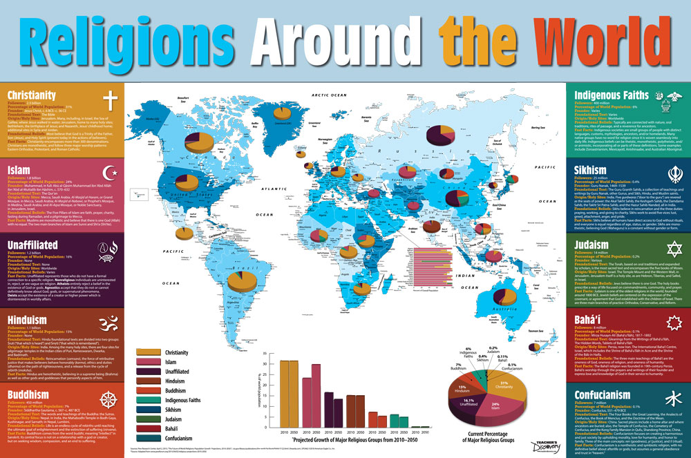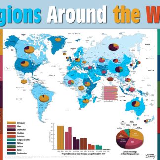 Across the globe, people of faith practice their beliefs every day. But what are those beliefs? And where do they live and worship? The 10 most-practiced religions–including unaffiliated individuals and indigenous religions–are described in accessible language arranged by: Religion Followers FounderPercentage of the World Population Foundational Text Origin/Holy Sites Foundational Beliefs Fast FactsA comprehensive world map features charts showing the distribution of belief by regions, which allows students to easily and graphically see where religions are practiced. Useful information, color coding, and different ways to access data make this a powerful resource for discussions of religion, geography, history, and the current geopolitical climate.span style=”color:#FF0000;”Download the FREE Religions Around the World Map Sources and Statistics PDF located in “Additional Info.”/spanCopyright 2018. High school. 36 x 24 inches. Laminated.