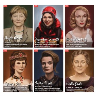 Angela Merkel, Marlene Dietrich, Sophie Scholl;hellip; the names of these influential women can conjure up strong emotions when they are mentioned. What better way to inspire your students than to remind your class of these six revolutionary women? Each German-speaking female made astounding achievements, showed incredible strength, and contributed immensely to society. Each poster details the woman’s name and contribution, plus her country of birth.Copyright 2019. Set of six posters, 13 x 19 inches each. Cardstock.Teacher’s Tip:p style=”margin-left: 40px;”These posters are a great staple for a unit on German-speaking women–during National German Week and on National Teach German Day. Or, teach about one or two women per month, when able, and update your display accordingly.