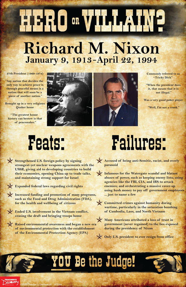 History tends to judge our past leaders as extremes: Benedict Arnold was a traitor! Abraham Lincoln was an American hero! As teachers, it’s tempting at times to present a world as black and white to our students: good or evil, friend or foe, hero or villain. Use this Richard M. Nixon mini-poster to help students take off the rose-colored glasses and see beyond the established historical narratives and into the real world of gray. Copyright 2016. 11 x 17 inches. Cardstock.