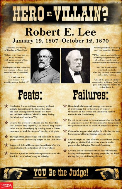 History tends to judge our past leaders as extremes: Abraham Lincoln was an American hero! Benedict Arnold was a traitor! As teachers, it’s tempting at times to present a world as black and white to our students: good or evil, friend or foe, hero or villain. Use this Robert E. Lee mini-poster to help students take off the rose-colored glasses and see beyond the established historical narratives and into the real world of gray. Copyright 2016. 11 x 17 inches. Cardstock.