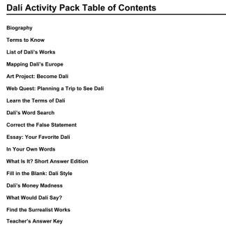 Make the most of your Salvador Dali exhibit with these ready to use cross-curricular activities. This activity pack features an assortment of reproducible activities from critical thinking exercises to puzzles. Inspired by great topics, created by teachers and ready for your classroom. Copyright 2008. English. Middle School and High School levels. Reproducible. 8 x 11 inches. 31 pages.
