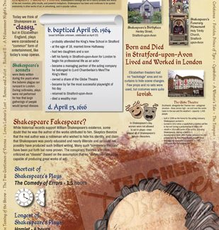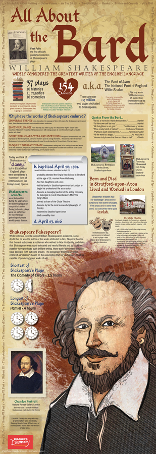 Students usually study some Shakespeare plays, but how much do they really know about the man himself? Why are his plays still so popular? What were the times he lived in like? Why do some people think he wasn’t responsible for the plays and sonnets attributed to him? The facts are presented in an entertaining, educational way! 13 x 38 inches. Laminated. Middle School, High School.