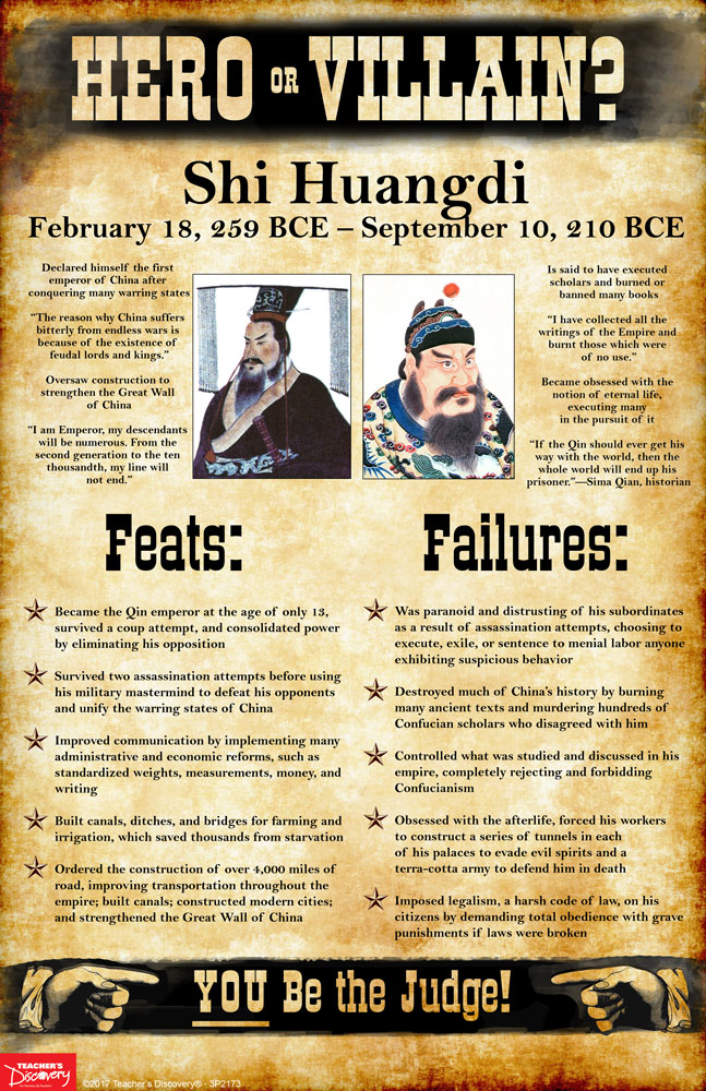 History tends to judge historical figures in extremes: Genghis Khan was a barbarian! Martin Luther was a religious hero! As teachers, it’s tempting at times to present the world as black and white to our students: good or evil, friend or foe, hero or villain. Use this Shi Huangdi mini-poster to encourage students to take off the rose-colored glasses and see beyond the established historical narratives, into the real world of gray.Copyright 2017. Middle school, high school. 11 x 17 inches. Cardstock.