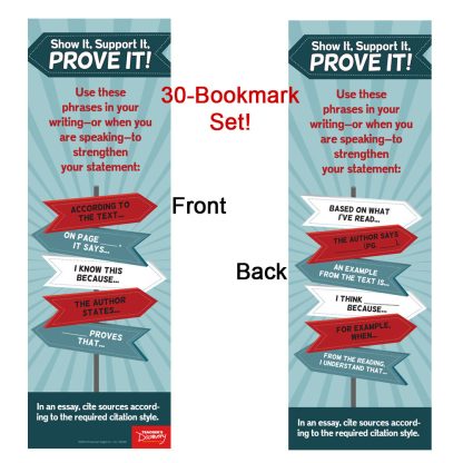 Two usages in one handy bookmark–students see writing prompts useful to support their claims as they read and/ hold their place in the book.Copyright 2018. Set of 30. 2 x 6 inches. Laminated.Pair them with the Show It, Support It Prove It! Poster (4P2317).
