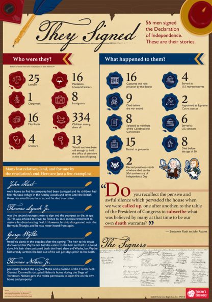 25 lawyers, 334 children between them all, and 9 died before the Revolutionary War ended. /emIn total, 56 men signed the most important document in American history, the Declaration of Independence. We know what they did, but do we really know their stories? span style=”color:#FF0000;”Download the FREE Teachable Moments PDF located in “Additional Info.”/spanAll levels. 19 x 27 inches. Laminated.