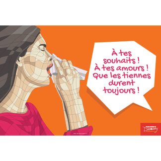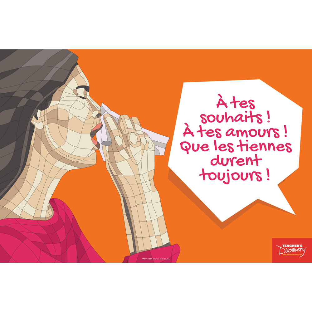Authentic expressions in French for sneezing: use ;ldquo;;Agrave; tes souhaits !/em;rdquo; for one sneeze, ;ldquo;;Agrave; tes amours !/em;rdquo; for two sneezes, and ;ldquo;Que les tiennes durent toujours !/em;rdquo;Copyright 2019. 19 x 13 inches each. Cardstock.