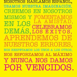 Set a positive tone for your Spanish class by reading this poster together and displaying it as a reminder for students to do their best every day. Poster reads: “In our classroom we: Speak Spanish. Use our imaginations. Create. Believe in ourselves and in each other. Encourage. Celebrate success. Learn from our mistakes. Respect each other. Try our best. Never give up.” Spanish. 13 x 19 inches. Cardstock.br /