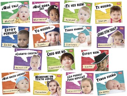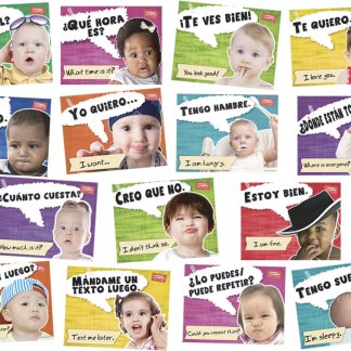 Expressive children’s faces paired with Spanish phrases make excellent visual cues and memory aides for your students. Use them as flash cards and hang them on a bulletin board. Contains 15 common phrases every student needs to know. 11 x 8 inch mini-posters. Not laminated. Heavy cardstock.