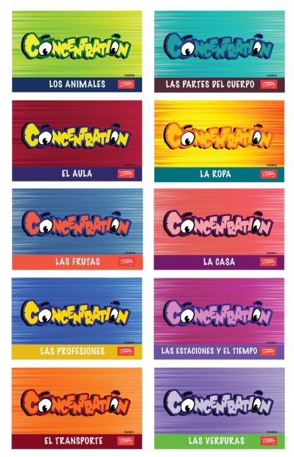 Concentration games are a classic favorite for all ages. Each topic contains 30 cards: 15 pictures and 15 vocabulary words. Copyright 2015. Two or more players. 5 x 3 inches. Cardstock. Not laminated.Note: Concentration game board sold separately.