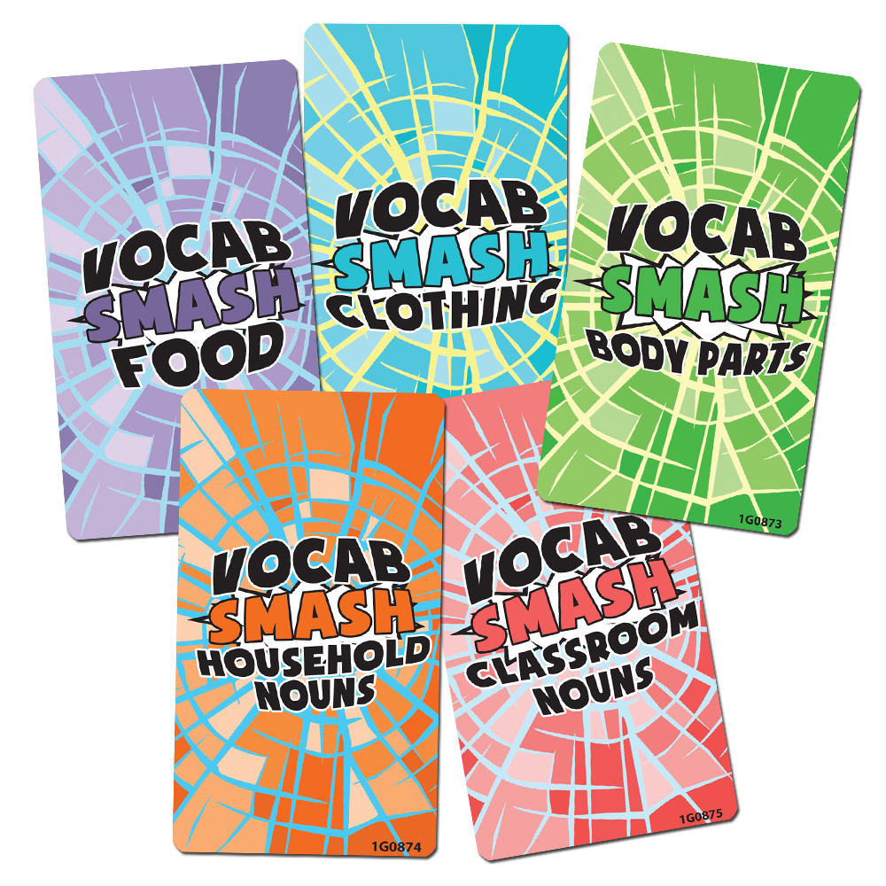 Vocab Smash has students using new vocabulary right away. Play a card from your hand, and place a chip on the matching image on the game board. The first person to get four in a row yells “Vocab Smash” and wins!Level 1.2dash;32 players.Eight game boards (10 x 7 inches).Eight decks of 43 cards each (3 x 2 inches per deck).480 colored chips, instructions, and game box.Copyright 2015