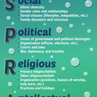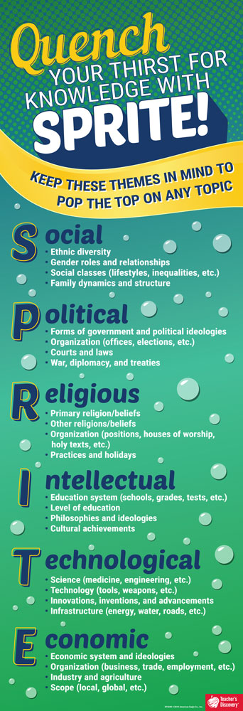 Students apply the six themes of SPRITE to break down and analyze the key factors of any historical or current event, civilization, or culture: Social Political Religious Intellectual Technological EconomicIncludes a FREE Teachable Momentssup/sup PDF download.Copyright 2019. All levels. 13 x 38 inches. Laminated.