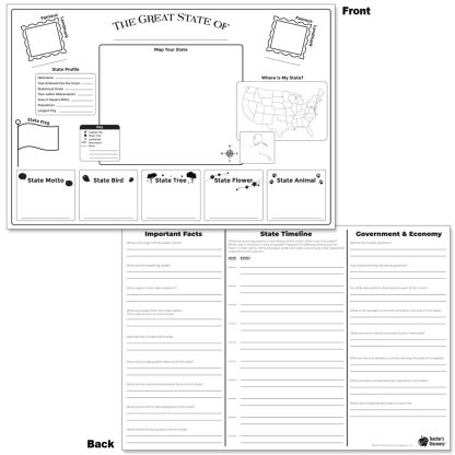 Which famous person is from your state? Which state flag is not in the shape of a rectangle? Students uncover more facts about the landmarks, government, economy, and history of their state. Set of 35 ready-to-color posters with activities on both sidesTeacher’s Guide PDF download with a project overview, student instructions, rubric, sources, extension activities, and reproducible handouts All levels. 19 x 13 inches. Cardstock.