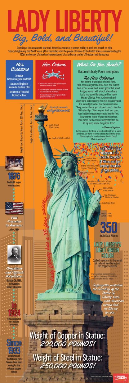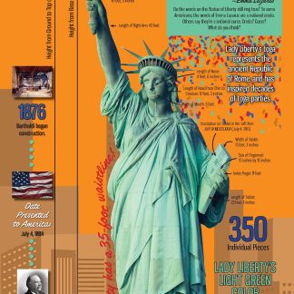 This colorful poster gives essential info about Lady Liberty, such as her history, symbolism, and poem inscription, while sharing quirky facts that your students haven’t likely heard before–why she’s green, that the suffragettes protested her unveiling, and how she has a 35-foot waistline! Copyright 2015. 13 x 38 inches. Laminated to last.