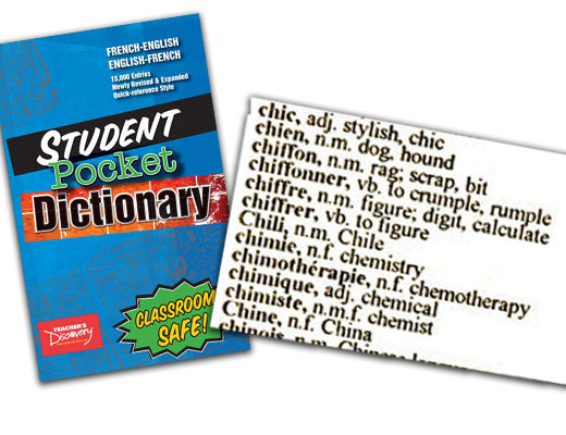 Contains easy one-word equivalent definitions. French, English. 15,000 entries. Middle School, High School. 4 x 6 inches. Softcover.