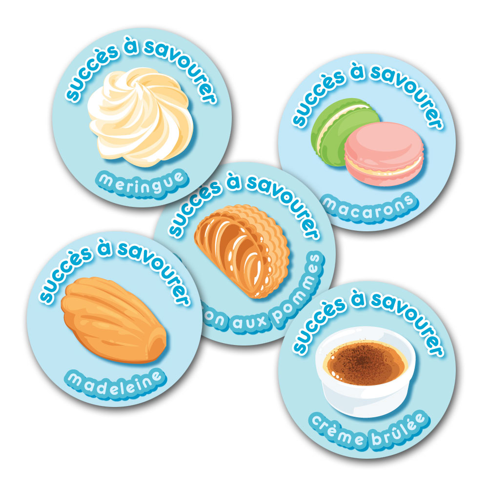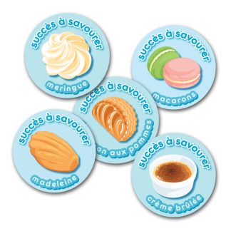 Students savor their success when you reward them with stickers featuring French sweets! Five sheets of 20 assorted full-color stickers, for a total of 100 stickers. Each round sticker measures approximately 1 inch across.