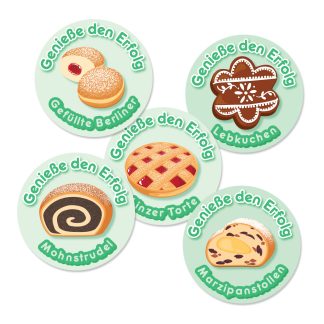 Students savor their success when you reward them with stickers featuring German sweets! Five sheets of 20 assorted full-color stickers, for a total of 100 stickers. Each round sticker measures approximately one inch across.